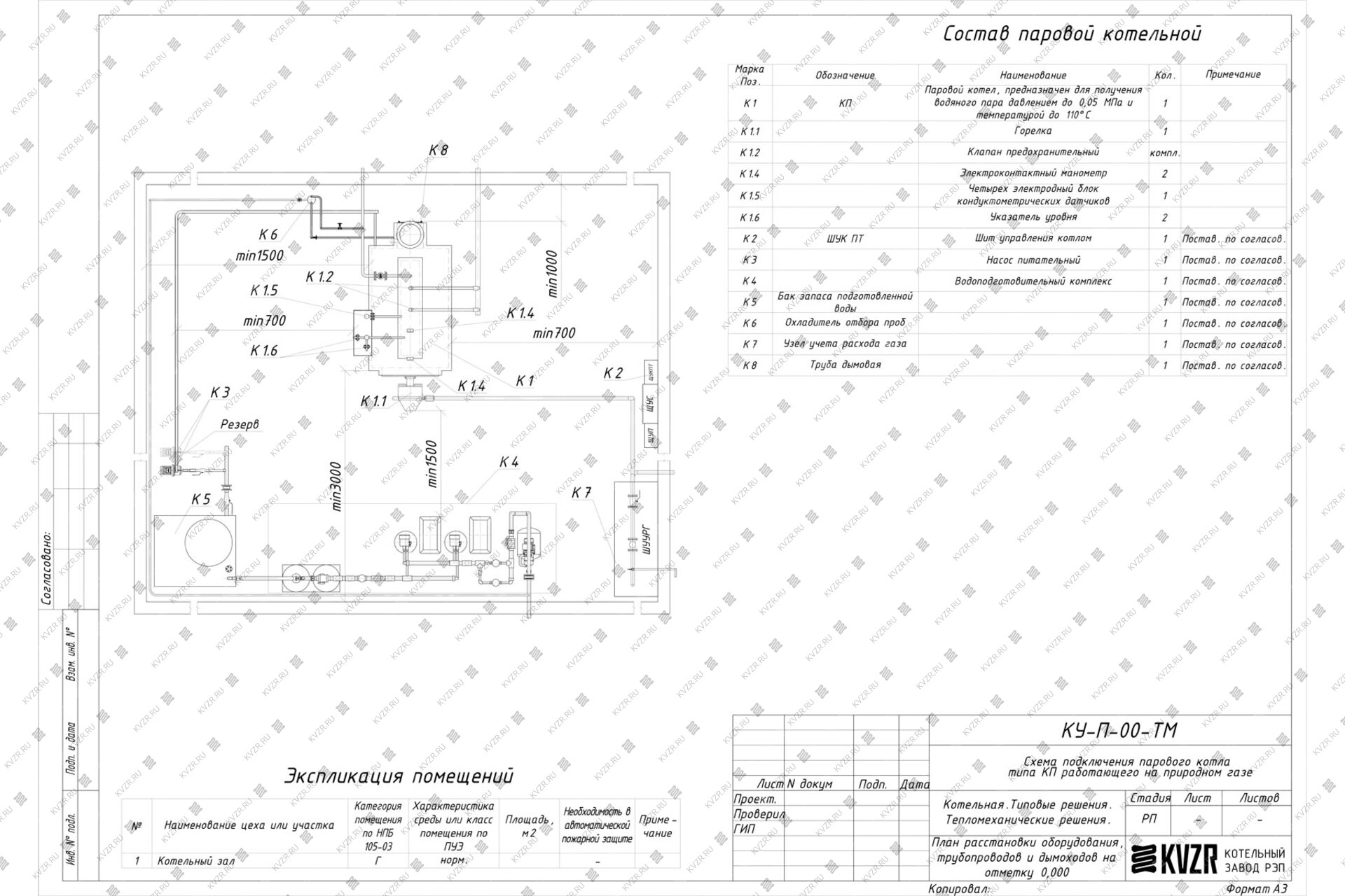 Чтобы правильно подключить газовый паровой котел 500 кг / 0.5 т пара -115 °С -0,07 МПа / 0,7 кгс/cм² в котельной необходимо оставить проемы для обслуживания оборудования во время эксплуатации. На представленной здесь схеме обозначены их размеры. Кроме того, в данной примерной схеме монтажа паровых котлов и оборудования указан перечень минимально необходимого вспомогательного оборудования.