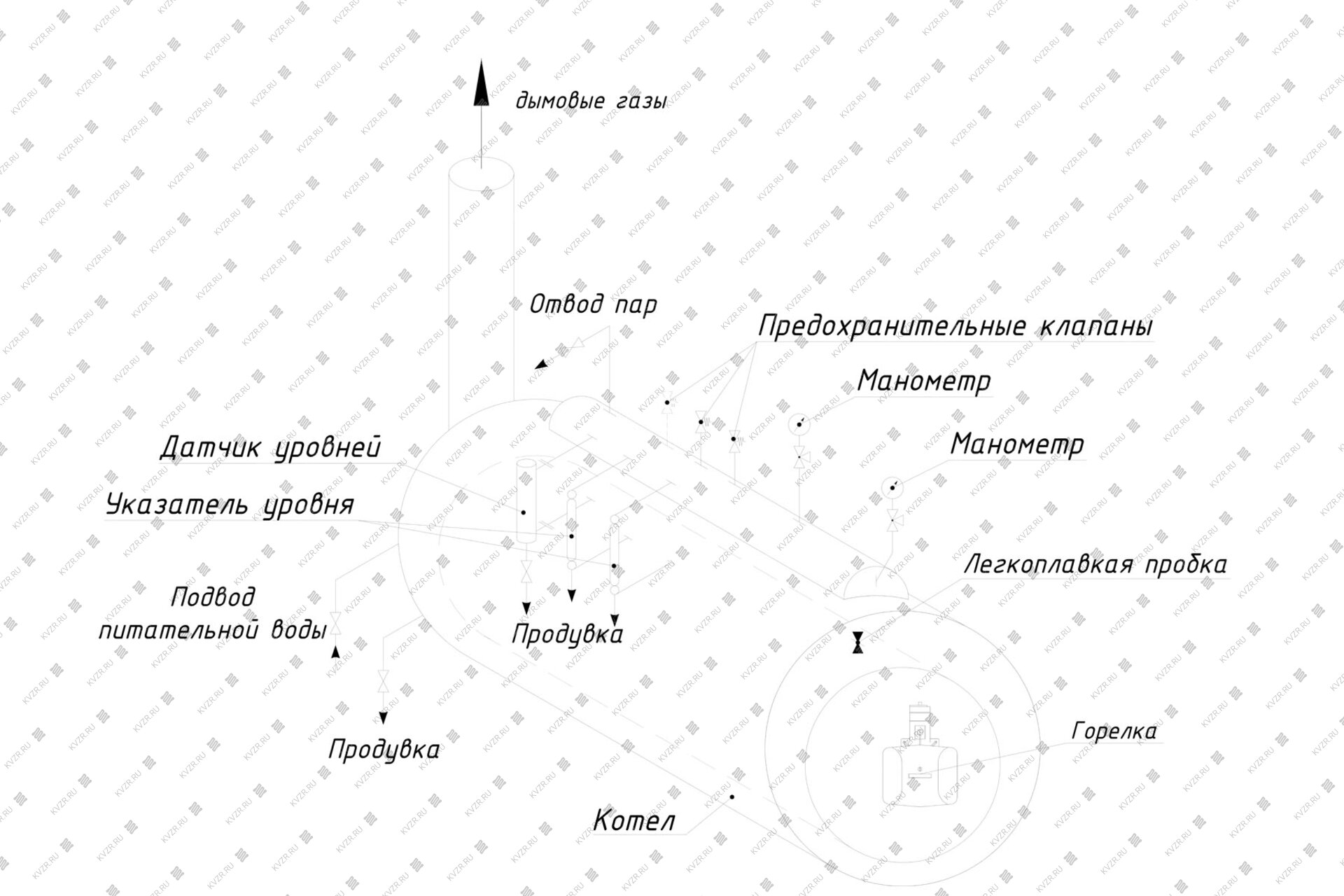 На боковой части корпуса устанавливается датчик уровней воды, связанный с паровым и водным пространством котла соединительными трубками не менее Ду25.