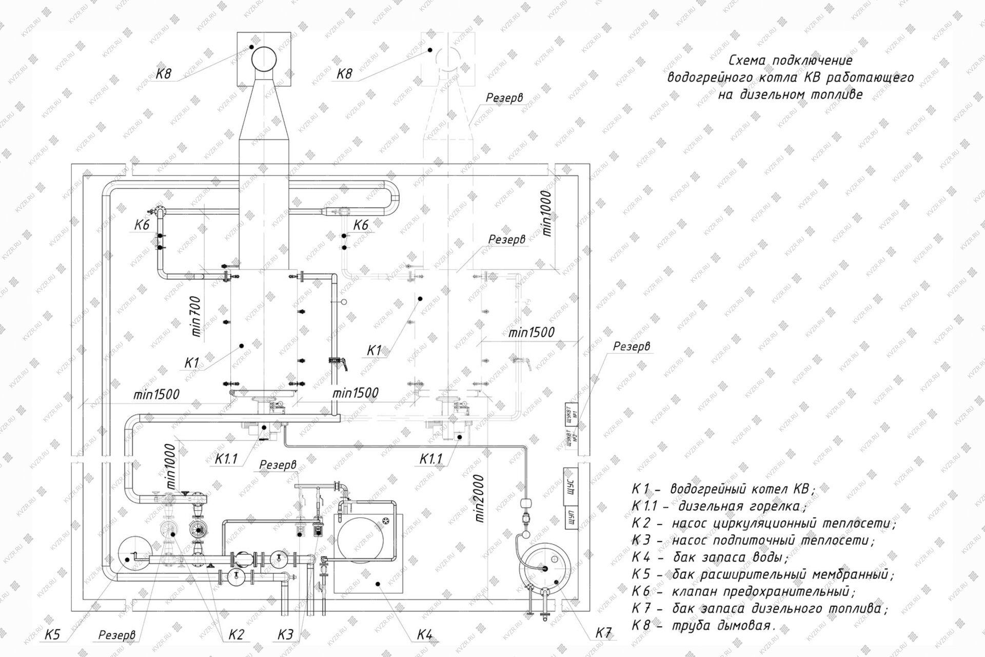 Чтобы правильно подключить котел 3.5 МВт на дизеле в котельной необходимо оставить проемы для обслуживания оборудования во время эксплуатации. На представленной здесь схеме указаны их минимальные размеры. Кроме того, в данной примерной схеме монтажа водогрейных котлов и оборудования указан перечень минимально необходимого вспомогательного оборудования для правильной работы котла.