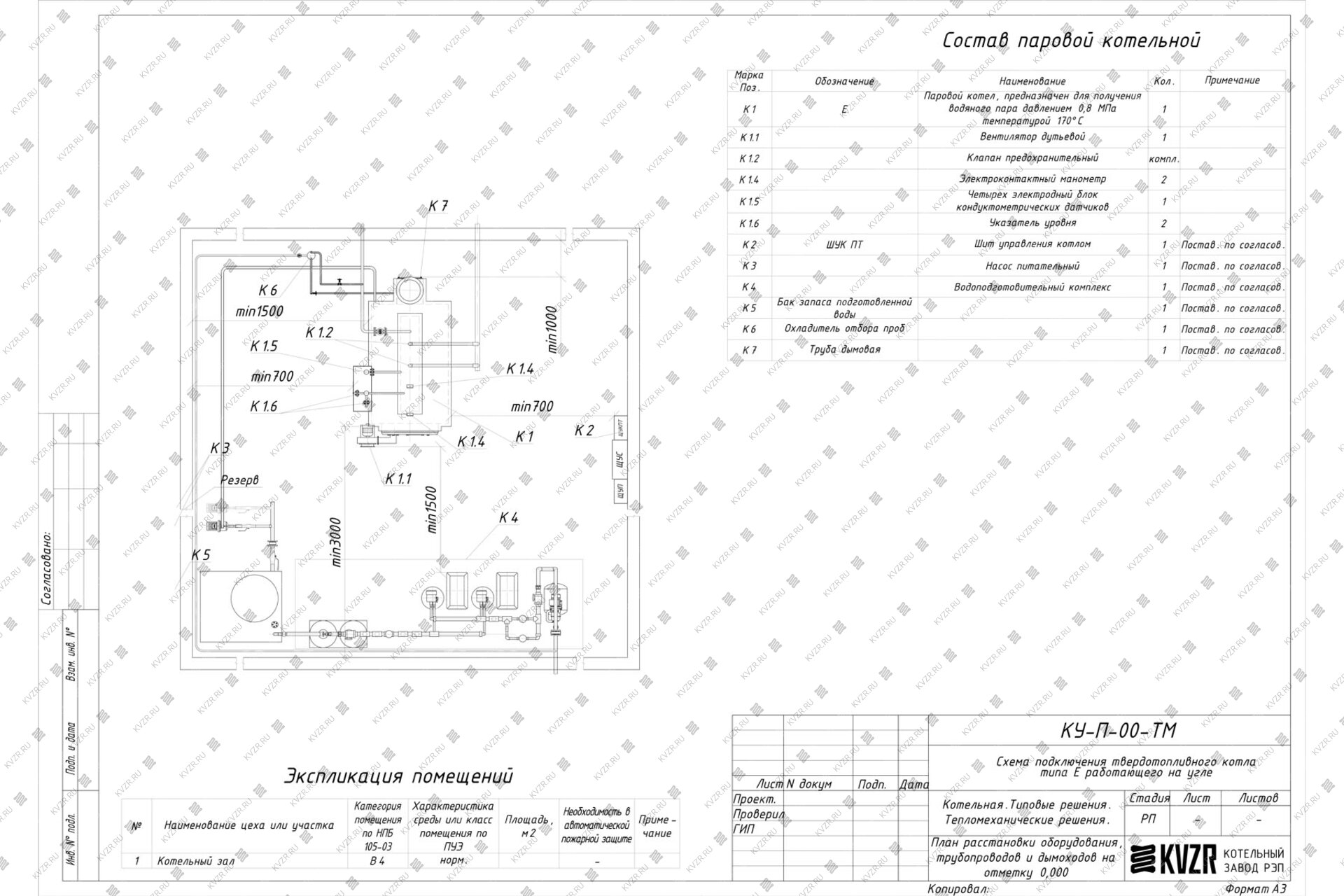 Чтобы правильно подключить парогенератор на угле 2000 кг до 130 °C / 1.7 бар в котельной необходимо оставить проемы для обслуживания оборудования во время эксплуатации. На представленной здесь схеме обозначены их размеры. Кроме того, в данной примерной схеме монтажа паровых котлов и оборудования указан перечень минимально необходимого вспомогательного оборудования.