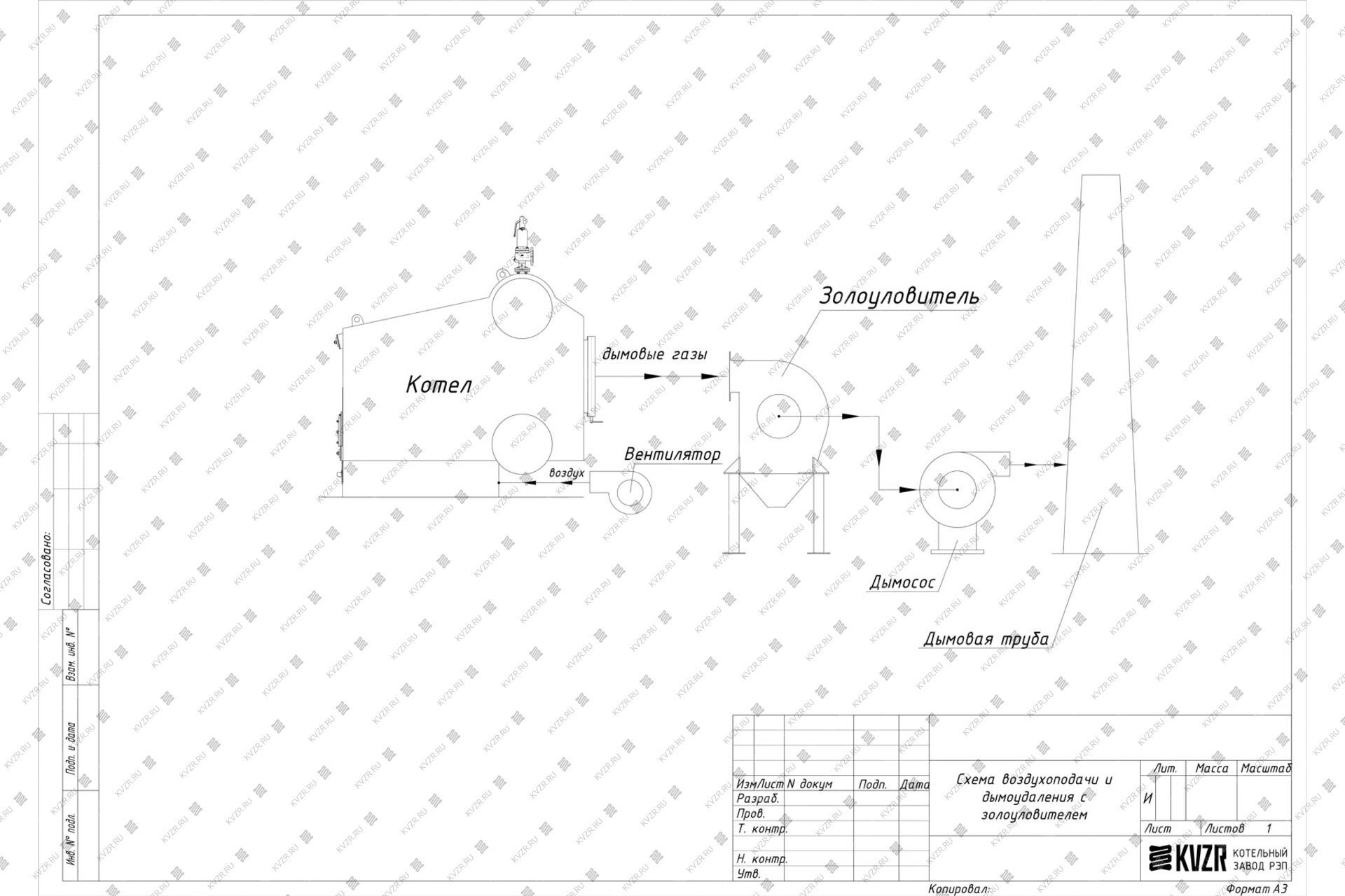 Если вам не требуется высокая очистка дымовых газов, котел может работать без золоуловителя. Схема подключения при этом следующая - дымовые газы выходят из котла в газоходы котельной, затем в дымосос и далее снова по газоходам в дымовую трубу. В зависимости от компоновки котельной дымосос может устанавливаться как в котельной, так и на улице. Наш завод производит газоходы и переходники к ним. Получив схему вашей котельной мы можем изготовить для вас комплект газоходов, переходников нужных размеров и сечений. На месте такие детали собираются как конструктор. Обращаем ваше внимание, что газоходы требуют изоляции, для защиты персонала от ожогов, так как уходящие газы имеют высокую температуру, а на улице газоходы требуют изоляции для избежания образования конденсата.