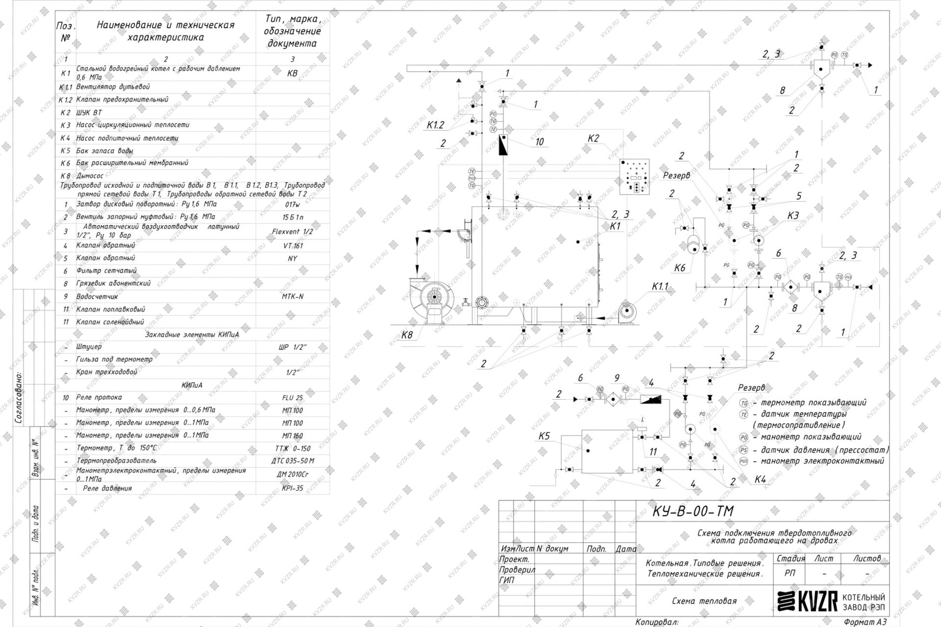 Образец тепловой схемы подключения дровяного котла на древесных отходах 0.5 МВт и вспомогательного оборудования в котельной приведен на данной схеме. При эксплуатации очень важно грамотно осуществить подключение оборудования, установить все контрольно измерительные приборы, для контроля параметров работы котельной и запорную арматуру для оперативного переключения потока теплоносителя при плановой или аварийной остановке оборудования. Данную схему можно использовать как пример для разработки под свой объект или заказать у нас разработку индивидуальной схемы для вашей котельной.